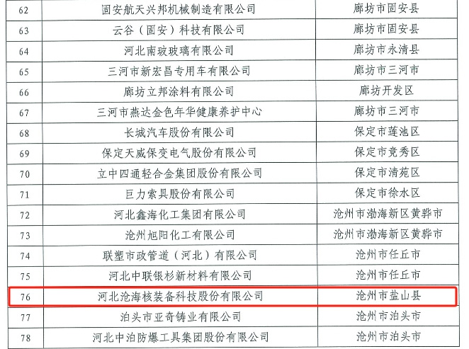 近日,河北省質(zhì)量強(qiáng)省戰(zhàn)略領(lǐng)導(dǎo)小組發(fā)布通知,河北滄海核裝備科技股份有限公司入選河北省質(zhì)量強(qiáng)省建設(shè)領(lǐng)軍企業(yè)培育名單,這也是滄海核裝獲得政府質(zhì)量獎(jiǎng)后獲得的又一質(zhì)量建設(shè)領(lǐng)域的榮譽(yù)資質(zhì)。